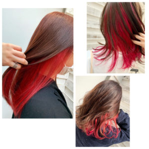 もっと派手な印象がいい方はインナーカラーレッド!表面のお色味が違うだけで印象がかなり変わります☆